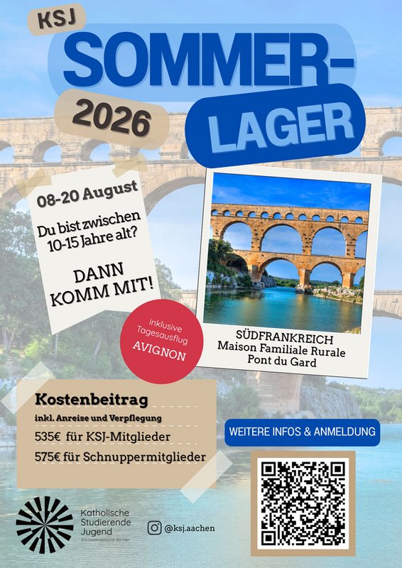 Vom 8. bis 20.08.2026 findet das Diözesane Sommerlager der Katholischen Studierenden Jugend Aachen in Südfrankreich, Pont du Gard statt.