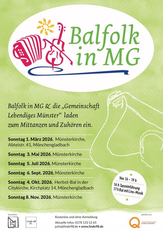 Jutta Kuhlen-Bauer: BALFOLK - Musik & Tanz zum Zuhören und Mitmachen - ist meine Herzenssache und bringt meine Laune immer wieder in Schwung. Darum freue ich mich, dass wir eine großzügige Förderung des Quartiermanagements Gladbach & Westend und einen Kooperationspartner Gemeinschaft Lebendiges Münster mit Ria Acht gefunden haben, die dieses Projekt möglich machen. Die Veranstaltungsreihe BALFOLK in MG findet immer sonntags von 16.00 bis 19.00 Uhr in der Münsterkirche in Mönchengladbach, Abteistraße 41, statt. Von 16.00 bis 17.00 Uhr gibt es jeweils einen Crashkurs, wo die wichtigsten Balfolk-Tänze geübt werden. Die Veranstaltungen sind für alle offen und kostenlos.