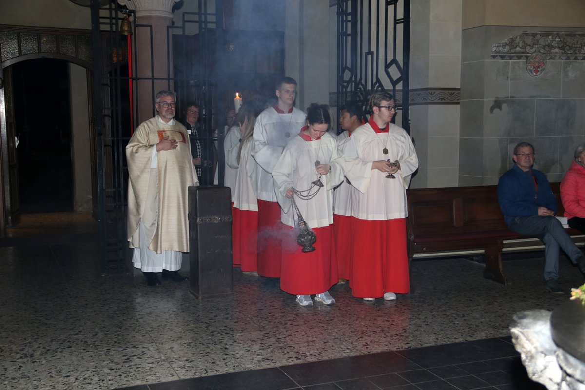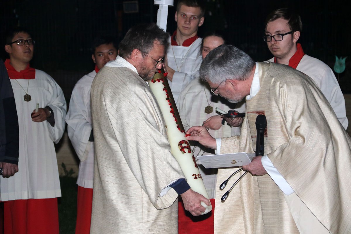 Gestern, am Ostersamstag, fand die Zeremonie zum 2. Mal im Laurentiusgarten (direkt neben der Kirche) statt. Die Vorbereitung und Segnung der Osterkerze durch den Priester symbolisiert den auferstandenen Christus, der als Licht die Dunkelheit vertreibt.  Bevor die Kerze entzündet wird, bestückt der Priester die Kerze mit Nagelsymbolen, die an die Wundmale Jesu (Hände, Füße, Seite) erinnern.