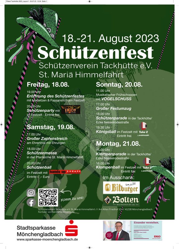 Weiter geht es am Samstagnachmittag mit dem Aufstellen des Königsmais an der Residenz von König Norbert im Schrödt. Von dort ziehen die Schützen zum Ehrenmal in der Tackhütte, wo nach dem Großen Zapfenstreich und der Gedenkrede verdiente Schützen ausgezeichnet werden. Die Gedenkrede hält in diesem Jahr Hans-Jürgen Schnaß, Vorstandsvorsitzender der mags AöR. Nach dem traditionellen Schützengottesdienst in der Pfarrkirche St. Mariä Himmelfahrt geht es weiter im Festzelt mit dem Schützenball, auf dem die Rockband „Hands up“ wieder für Stimmung sorgen wird.