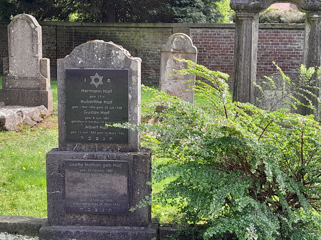 Aus der Zeit von 1845 bis 1942 bestehen noch 68 Grabsteine. Der Name „Harf“ taucht immer wieder auf. Der Grund dafür ist, dass nach einem Edikt von Napoleon sich alle Juden „Allerweltsnamen“ zulegen mussten, wie Quack, Gormanns, Simons oder auch Harf. Ob sich der Name „Harf“ auf den biblischen König David bezieht, der häufig mit einer Harfe dargestellt wird, ist nur eine Vermutung.