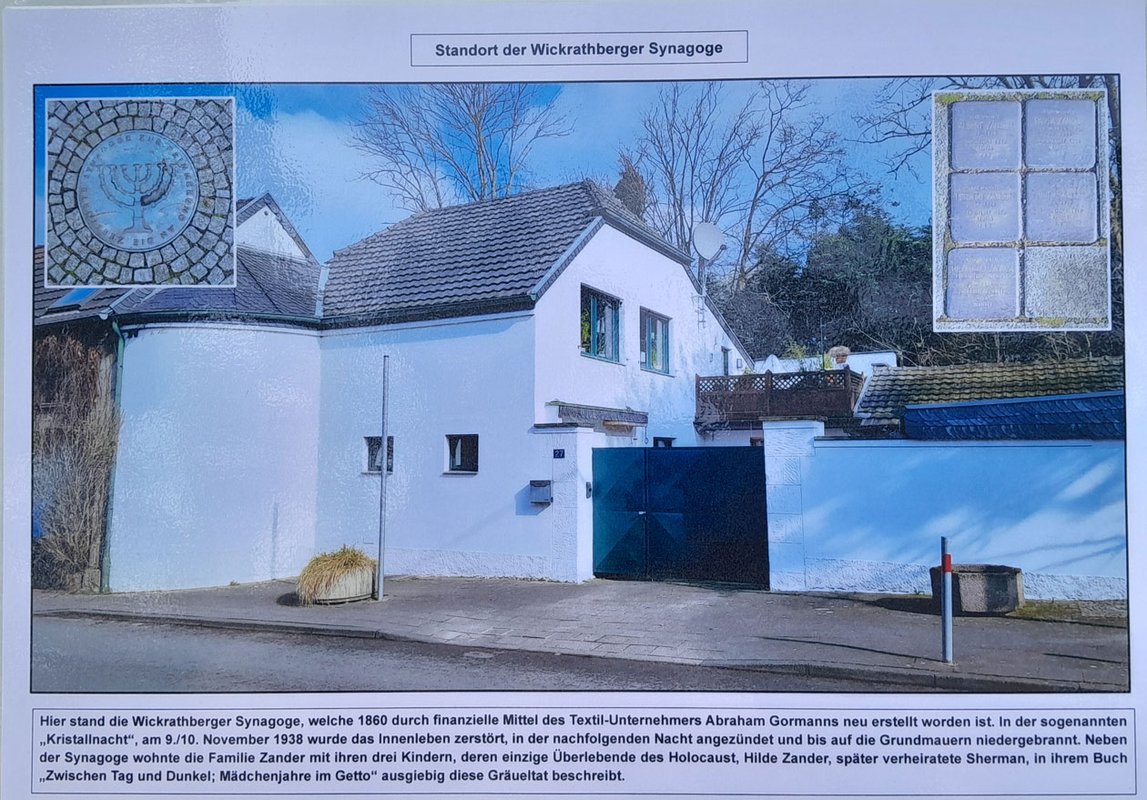 Es gibt ein Buch von Hilde Sherman, geb. Zander „Zwischen Tag und Dunkel - Mädchenjahre im Ghetto“, worin die Gräueltaten, Zerstörung, die erschreckenden Ereignisse sehr eindrucksvoll beschrieben werden. Belegt ist heute, dass der Lehrer Emil Vits, der 1968 mit allen Ehren in den Ruhestand entlassen wurde, am Tag nach der „Kristallnacht“ mit den Schülern seiner Klasse in die Wickrathberger Synagoge eindrang und den Rest zerstörte.